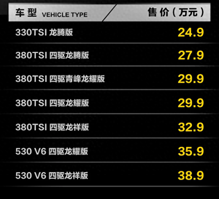 動力部分,新款車型將繼續搭載2.0T渦輪增壓發動機和2.5T V6發動機,330TSI達到了186馬力,380TSI達到了220馬力,530 V6版本達到了299馬力,傳動系統為7擋雙離合變速箱。