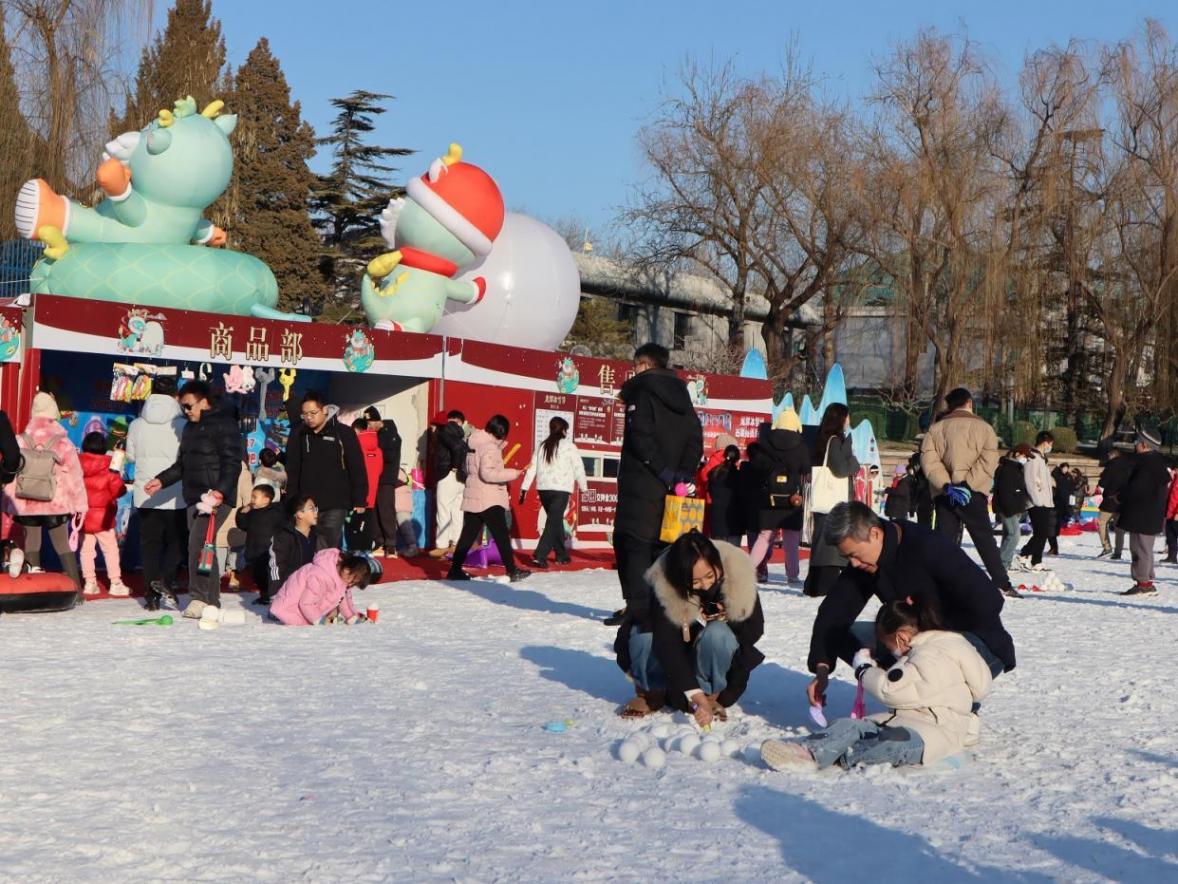 走進龍潭公園北門,只見銀白的“雪被”覆蓋北側湖面,游客仿佛置身童話般的冰雪世界。卡通龍玩偶、龍氣球和冰雕吸引不少小朋友拍照留念,樂園里不少龍年元素裝點出喜氣洋洋的節日氛圍。