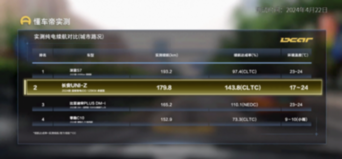 在純電續航測試環節中,懂車帝將路線設置在北京三環和四環,全程平均車速控制在30-35公里/小時。經懂車帝測試,長安UNI-Z的純電續航里程達179.8公里,大幅超出其CLTC工況下標稱的125公里,續航達成率達143.8%,而在WLTC工況下其續航達成率更是高達189%。如此大幅度的反向虛標,長安UNI-Z堪稱汽車界的純電續航“虛標王”。該成績不僅優于一同測試的零跑C10、深藍S7和比亞迪宋PLUS DM-i,也較宋PRO DM-i 實測的141.3公里純電續航有明顯優勢。