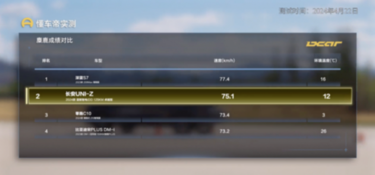 麋鹿測試是國際上衡量車輛安全性和操控穩定性的重要標準之一,考驗汽車的緊急避讓能力和電控系統的標定。此次實測中,懂車帝也對長安UNI-Z進行了相關測試。在測試中,長安UNI-Z始終保持車身姿態穩定,未出現兩車輪同時離地或車身大幅彈跳等危險姿態,即便將車速提高到85公里/小時,車身姿態依然保持穩定安全狀態。經多次測試,長安UNI-Z最終取得了75.1公里/小時的最高通過速度,優于宋PLUS DM-i和零跑C10,較宋PRO DM-i 70.2公里/小時的最高通過速度更是優勢明顯。