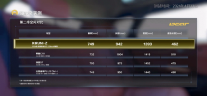 懂車帝也通過HPM標準測試假人對長安UNI-Z的空間表現進行了實測。測試顯示,長安UNI-Z表現優秀,第一排高度989mm,用戶最為關注的第二排腿部空間也達到了749mm,膝部空間接近兩拳。相較于其他競品,長安UNI-Z與宋PLUSDM-i的第二排腿部空間在此次測試中并列第一。