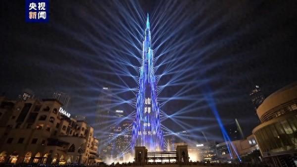 在現(xiàn)場(chǎng)觀眾的齊聲倒計(jì)時(shí)中,哈利法塔的樓面LED屏用阿拉伯語、英語和中文顯示出“祝您新年快樂”的字樣。當(dāng)時(shí)間走進(jìn)2024,大樓四周向外同時(shí)噴射出璀璨的煙花,點(diǎn)亮迪拜夜空。