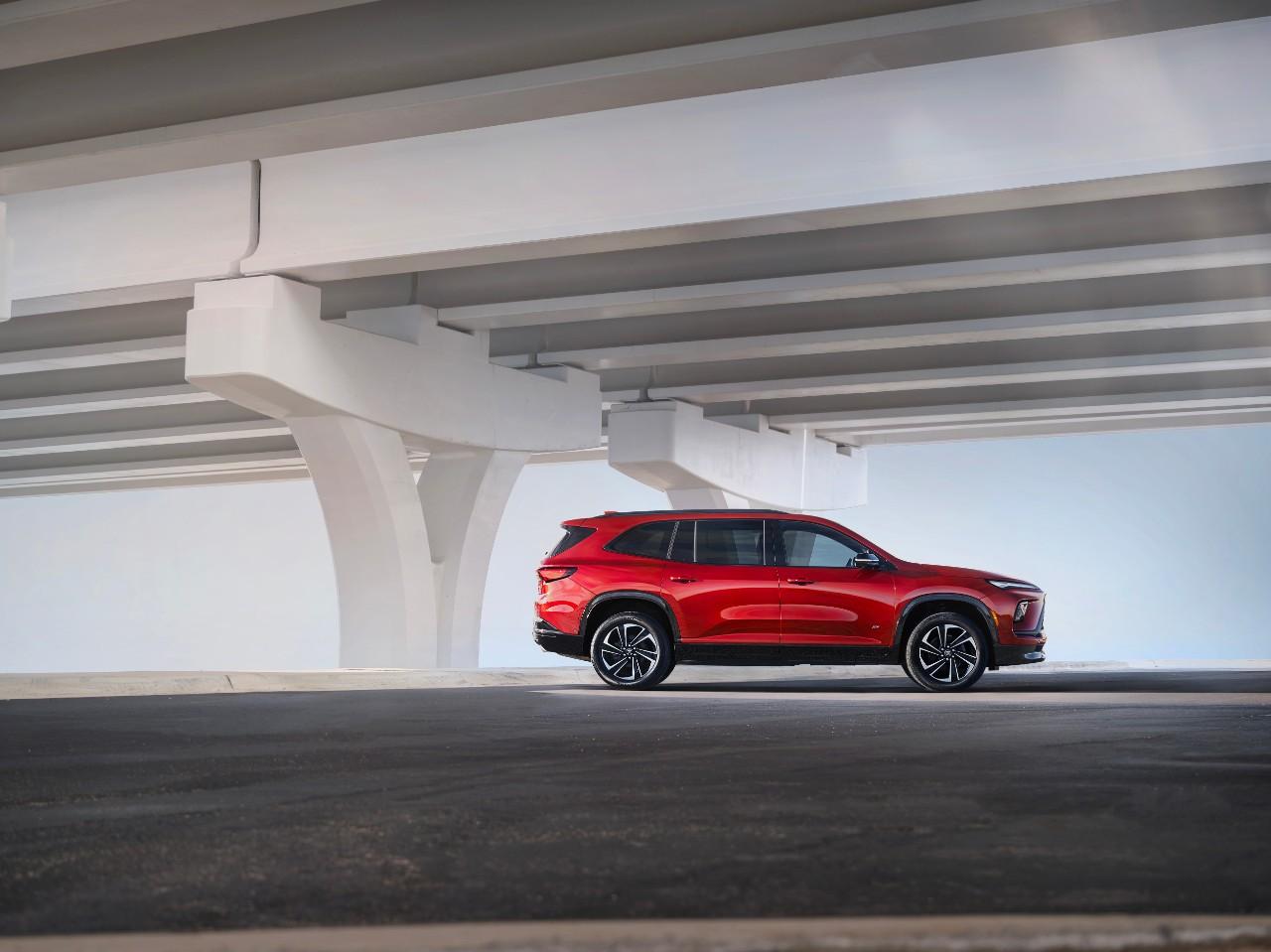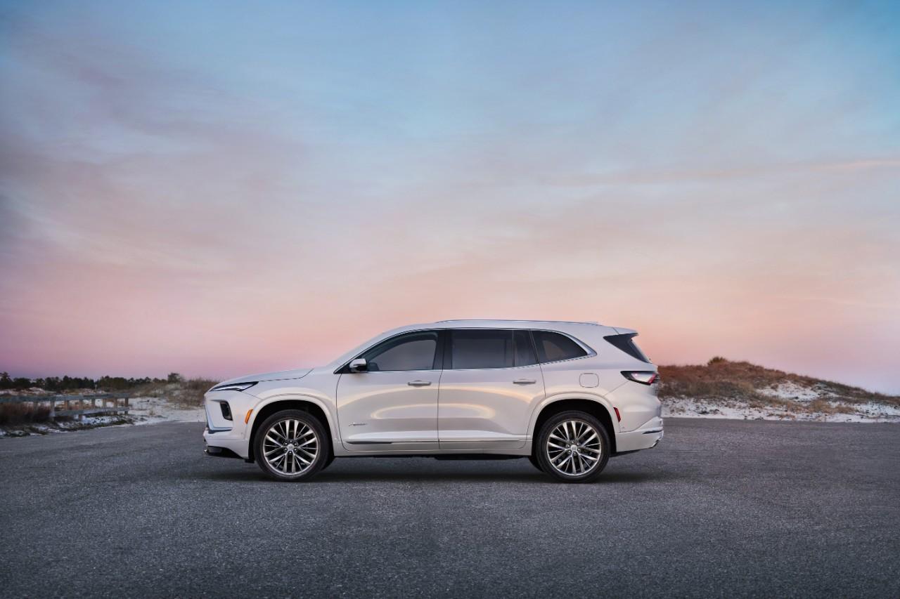 官方未披露該車尺寸信息,僅表示新款車型比上一代車型更長、更寬、更高,且提供了強大的路面表現力(現款昂科旗長寬高分別為 4981/1953/1722mm,軸距 2863mm)。該車配有懸浮式中控臺,上方設立了儲物空間、手機無線充電,搭載了號稱同類最大的 30 英寸一體式車機屏幕。