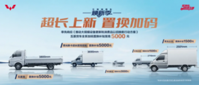 同時,4月五菱汽車開啟五菱商用車煥新季,率先響應《推動大規模設備更新和消費品以舊換新行動方案》,貨車全系加碼置換補貼至高5000元。兩款超長上新,全系置換加碼,助力廣大用戶創業致富之路。