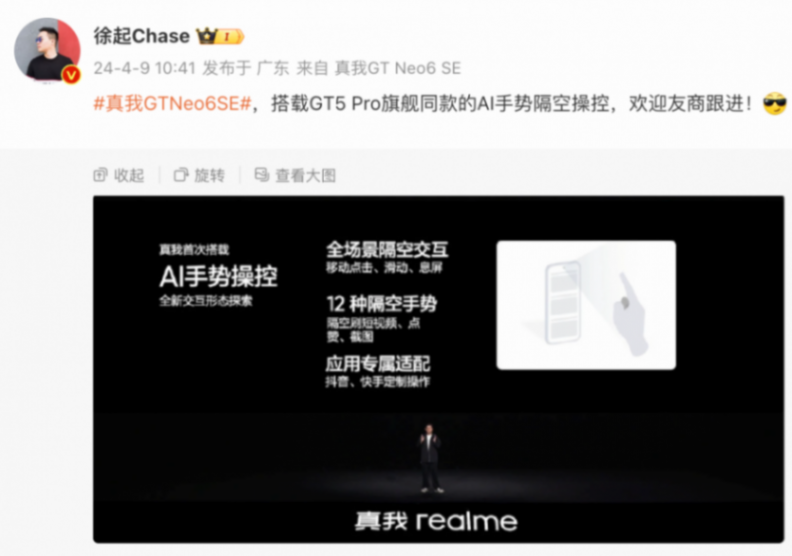 不過說到AI隔空手勢,真我這邊就有話說了,realme中國區總裁徐起表示真我GT5 Pro就配備有AI手勢隔空操控,這次真我GT Neo6 SE也將搭載旗艦同款功能,歡迎友商跟進。你的手機有AI隔空手勢嗎?