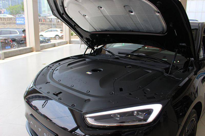 如前所述,問界新M5仍然提供純電版本和增程版本可選?!盾噭恿Α反舜闻臄z的車型為后者,打開前機蓋可以看到被包裹得嚴嚴實實的增程器。如果是純電版本,出現在眼前的則是一個擁有不錯空間表現的前備箱。