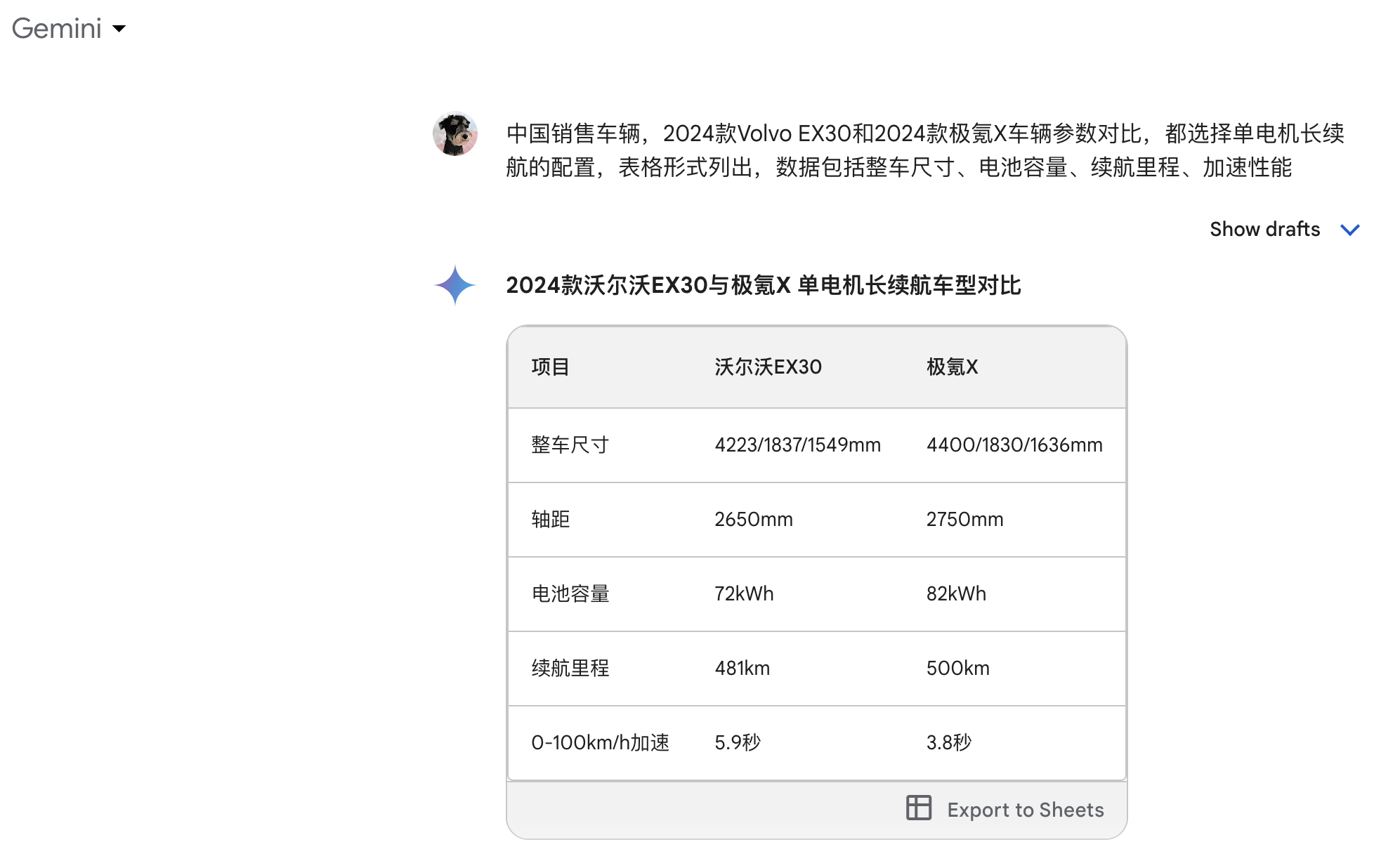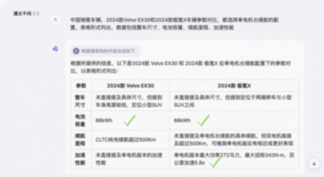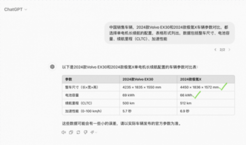 問題如下:中國銷售車輛,2024款Volvo EX30和2024款極氪X車輛參數對比,都選擇單電機長續航的配置,表格形式列出,數據包括整車尺寸、電池容量、續航里程(CLTC)、加速性能。