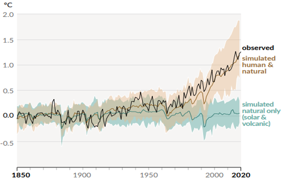 使用人為和自然因素以及僅使用自然因素觀測和模擬的全球地表溫度變化(年平均值)