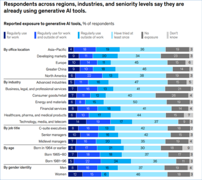 去年麥肯錫通過6個月的調研得出:在亞太和北美地區,41%的被調查者在工作或生活中常規性地使用AI工具;在技術、媒體、電信領域,50%的被調查者在工作或生活中常規性地使用AI工具;17-32歲的被調查者常規使用AI工具者達51%。