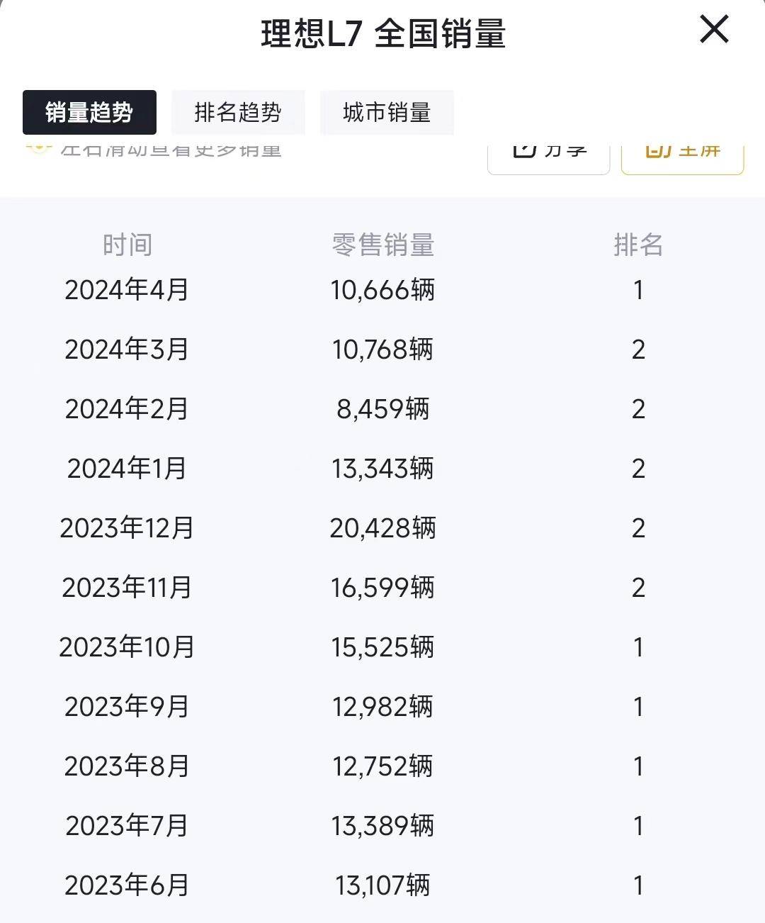 從L7的銷量看,今年以來4個月就有一個月沒超過1萬臺,而在2023年6月到12月,銷量全部在一萬臺以上,不得不說,這有點走下坡路的跡象。尤其是L6的到來,很可能會蠶食一部分L7的市場。
