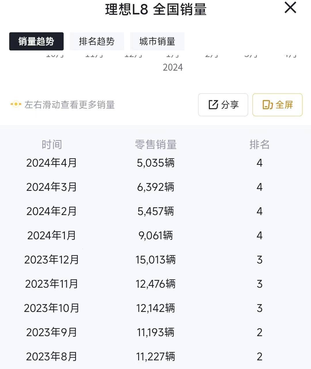 最后看下L8,在2024年1月到4月,月銷量因為破萬,甚至跌倒了5000多臺,而在2023年8月到12月的月銷量均在一萬臺以上。下坡趨勢明顯,理想L8該想想辦法了。