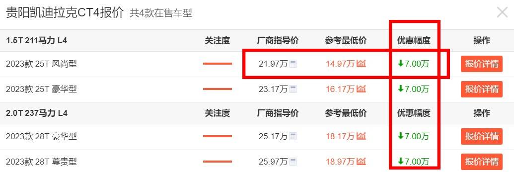 具體來看,指導價21.97-25.97萬元區間的凱迪拉克CT4,目前在貴陽地區的優惠幅度已經來到了7萬元。而優惠完之后,新車的報價也已經來到了14.97-18.97萬元區間,怎么樣,這價格看著是不是就很有性價比了呢?