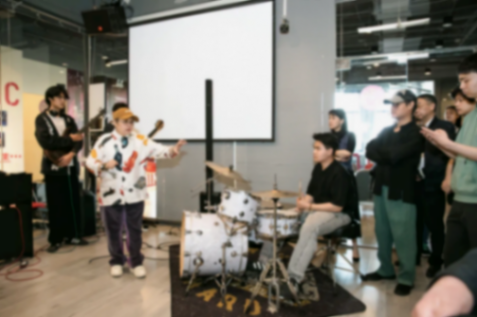 5月8日,在多功能教室,韓紅觀看學院學生樂隊爵士樂合奏,并親自指導同學們現場演奏的細節與技巧。