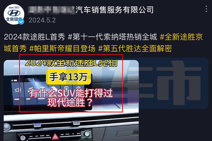 北京現(xiàn)代某4S店在社交平臺上配文表示,2024款全新途勝L亮相,手拿13萬,有什么SUV能打得過?這或預(yù)示著新途勝L的起售價在13萬元左右。