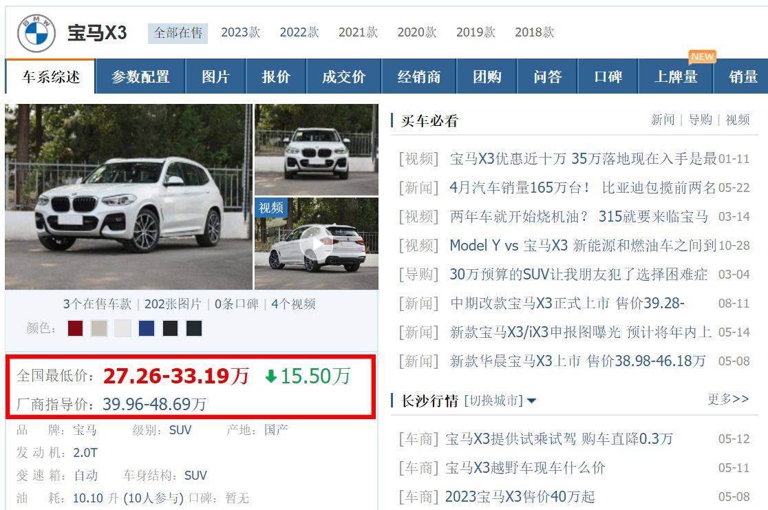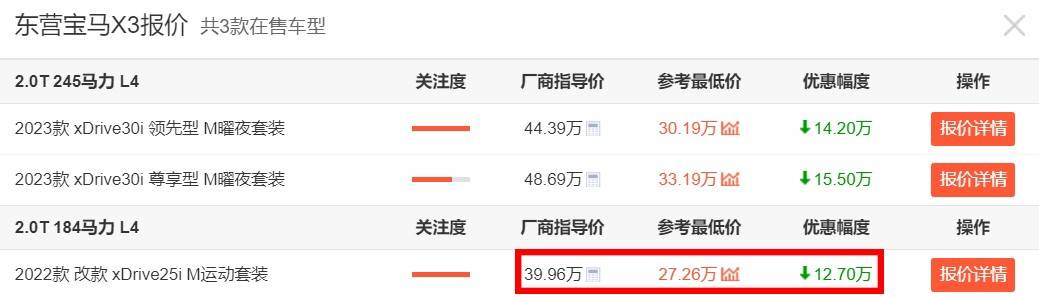 不過,在今天這個國產新能源車崛起的時代背景下,很多朋友可能要打破原先對于寶馬X3的一些認知了,為啥這么說呢?因為從我們近期在4S店所了解到的情況以及結合網上面給出的報價來看,原價近40萬起步的寶馬X3,其實眼下在終端的最低價格已經來到了27萬多。而且這個價格在全國很多地區都有,這也就證明:寶馬X3終端優惠大、價格跳水已經是基本的事實。