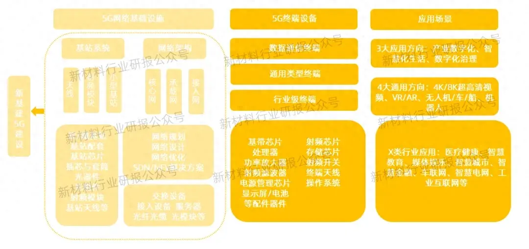 5G產業鏈包括5G網絡基礎設施、5G終端設備、應用場景等環節,其中5G網絡基礎設施包括基站系統、網絡架構等,5G終端設備包括數據通信終端、通用類型終端、行業級終端等,應用場景包括產業數字化、數字產業化、4K/8K超高清視頻等。
