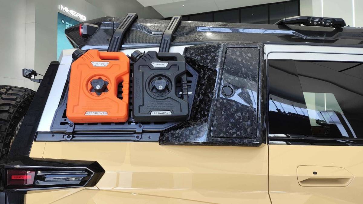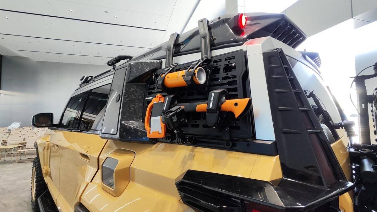 在C柱位置,猛士917蛟龍戰甲巧妙地設計了一個掛架,展車上的掛架上放置了滅火器、消防斧等實用工具,體現了其多功能性和實用性。當然,這個掛架也可以根據車主的個人需求進行個性化配置,放置所需的物品。此外,猛士917蛟龍戰甲車頂拓展平臺上集成了前射燈、營地燈、示廓燈等多種功能,為戶外探險和露營提供了便利。同樣,這些裝備也可以根據車主的喜好和需求進行個性化設置,滿足不同的使用場景和需求。