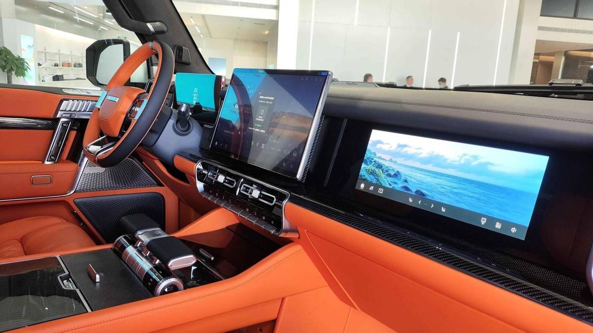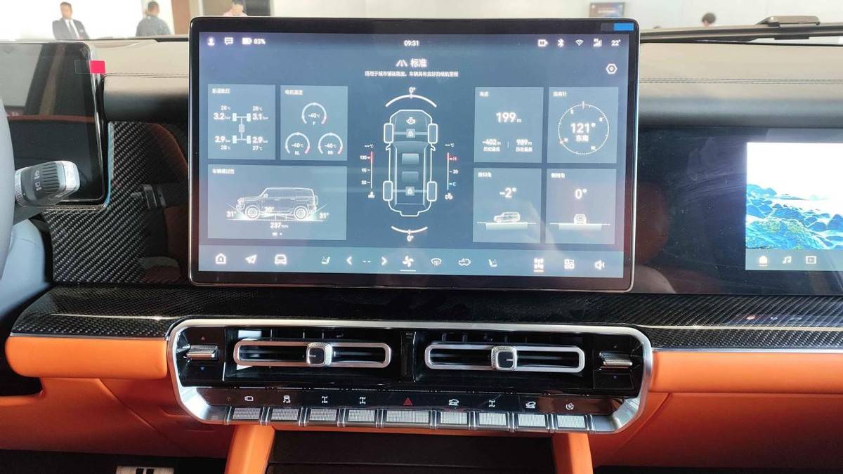 標準的T字形座艙設計使得整體布局非常規整,科技感十足。內飾配置上,除了配備12.3英寸的液晶屏和15.6英寸的中控屏外,還設了12.3英寸的副駕駛娛樂屏,為乘客提供了豐富的娛樂體驗。而在細節用料上,猛士917蛟龍戰甲同樣不遺余力,中控臺的部分區域采用了碳纖維材質飾板進行裝飾,不僅提升了整體的質感,也展現出了其對于細節的精心打磨。
