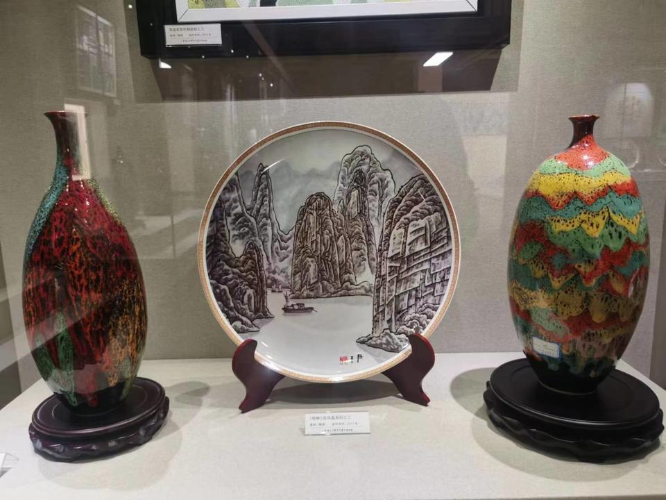 記者注意到,尹干藝術博物館第一展廳以陶瓷為主,展陳了高溫窯變花釉、陶藝、陶瓷雕塑、釉下青花、刻瓷、釉中彩陶瓷、日用陶瓷等藝術品。第二展廳以琉璃為主,展陳了七彩琉璃瓶、流光溢彩琉璃瓶、炫彩琉璃瓶、琉璃盤等藝術品。