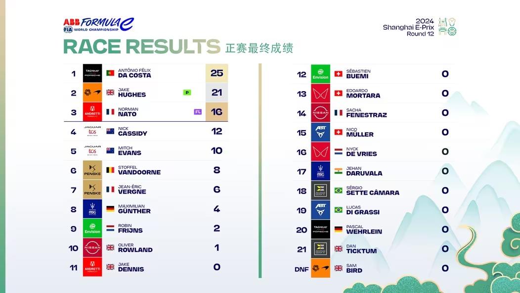最后一圈比賽,達(dá)科斯塔憑借著卓越的駕駛技藝與無懈可擊的競賽策略,成功取得上海站第二輪比賽冠軍。杰克·休斯憑借其堅(jiān)持不懈的努力與臨場的穩(wěn)健發(fā)揮收獲亞軍,而納托則緊隨其后,以非凡的毅力和精湛技巧鎖定領(lǐng)獎(jiǎng)臺(tái)的最后一席。中國ERT車隊(duì)的塞爾吉奧·塞特·卡馬拉和丹·提克圖姆分別排名第18、第21。