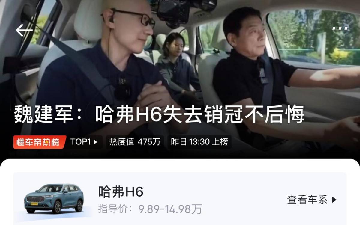 魏建軍:哈弗H6失去銷冠不后悔。網(wǎng)友:閉門造車,活在過(guò)去