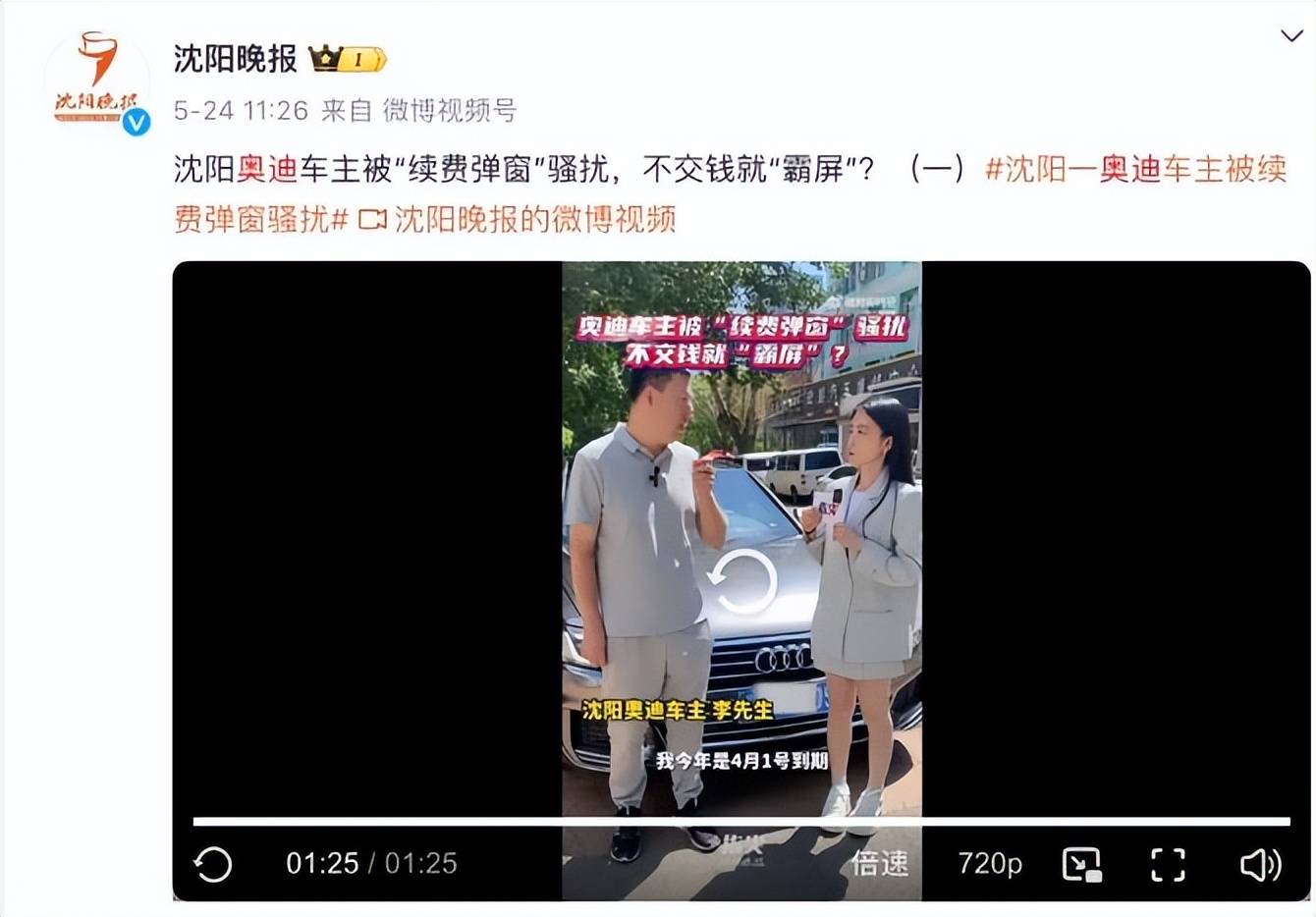 而在5月24日,據“沈陽晚報”報道,近期沈陽一奧迪車主的車機聯網服務到期后,每次啟動車輛時“續費提醒”彈窗立刻顯示在中控屏幕上,出現“霸屏”的情況,如果不手動關閉,彈窗會一直顯示,嚴重影響駕駛安全。