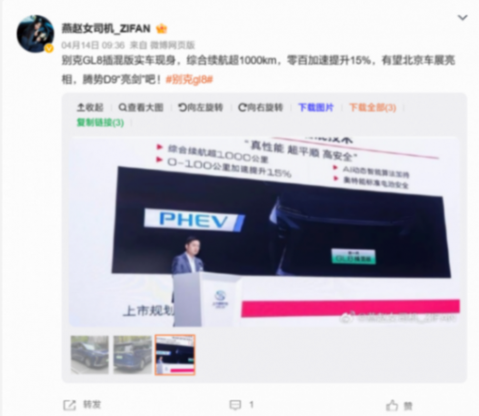 汽車博主“燕趙女司機_ZIFAN”曬出了一張產品宣傳圖,透露新車將擁有超過 1000 公里的綜合續航,百公里加速(預計為相比燃油版 GL8)提升 15%,號稱“真性能、超平順、高安全”。