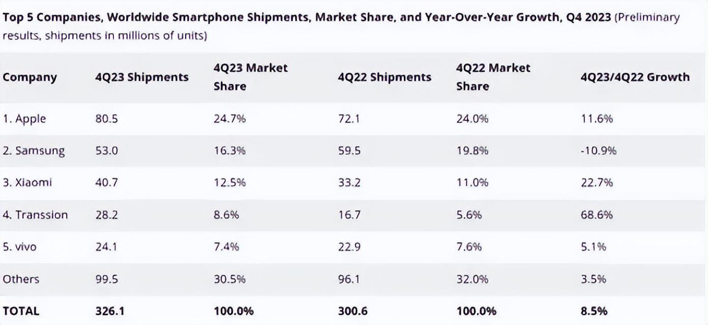相反,在這份報(bào)告中,除了三星微降,小米和傳音都取得了大幅增長,小米出貨量同比增加33.8%,市場份額從11.4%,上升到了14.1%。