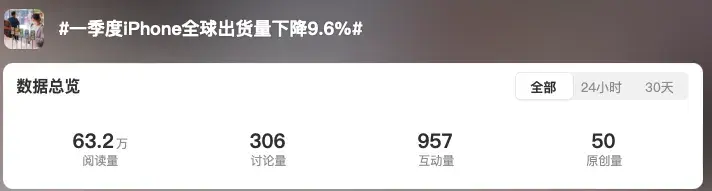 喜大普奔的另一面,具體到廠商,可以說幾家歡喜幾家愁。比如蘋果一大早就沖上了熱搜,iPhone一季度全球出貨量下降9.6%。