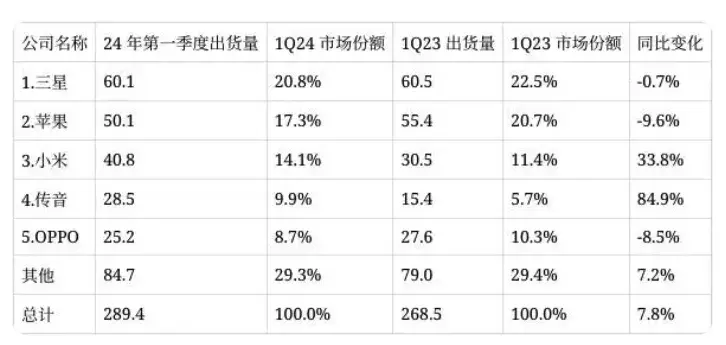 即2024 年第一季度(1Q24)全球智能手機(jī)出貨量同比增長 7.8% 至 2.894 億部。