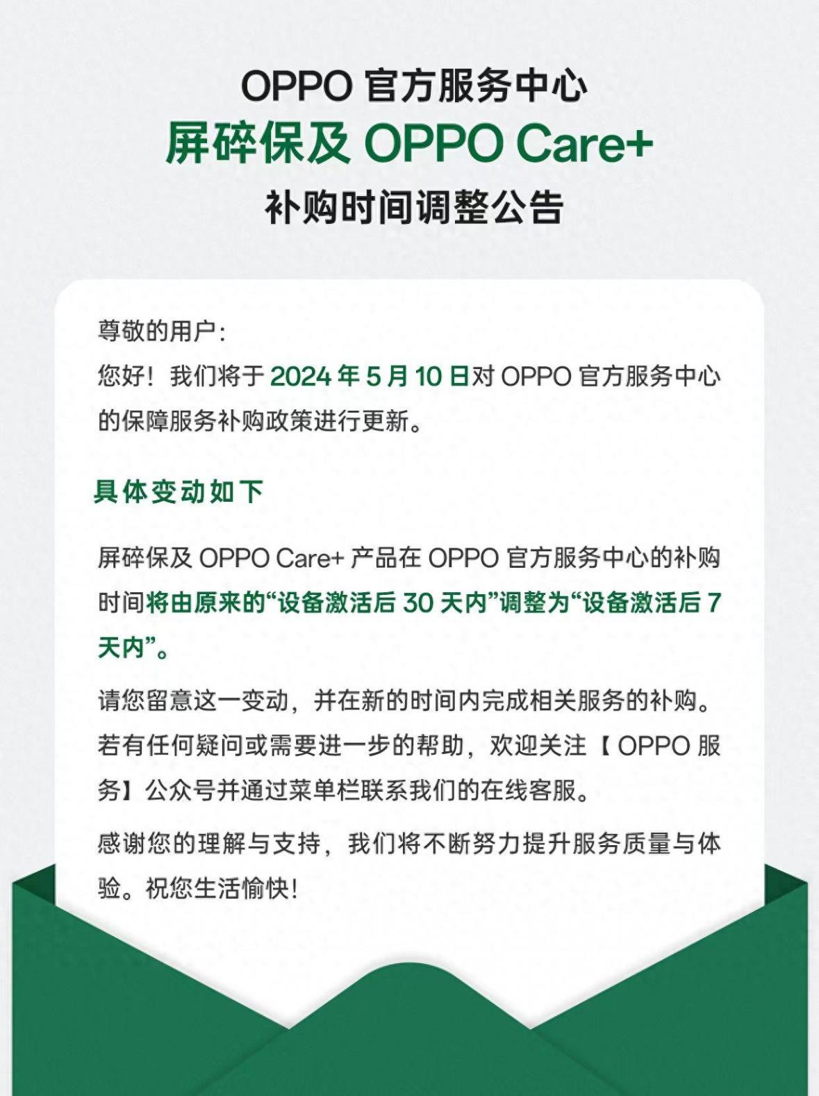 4 月 15 日消息,OPPO 宣布調整官方服務中心屏碎保及 OPPO Care+ 補購時間,由“設備激活后 30 天內”調整為“設備激活后 7 天內”,5 月 10 日起更新政策。