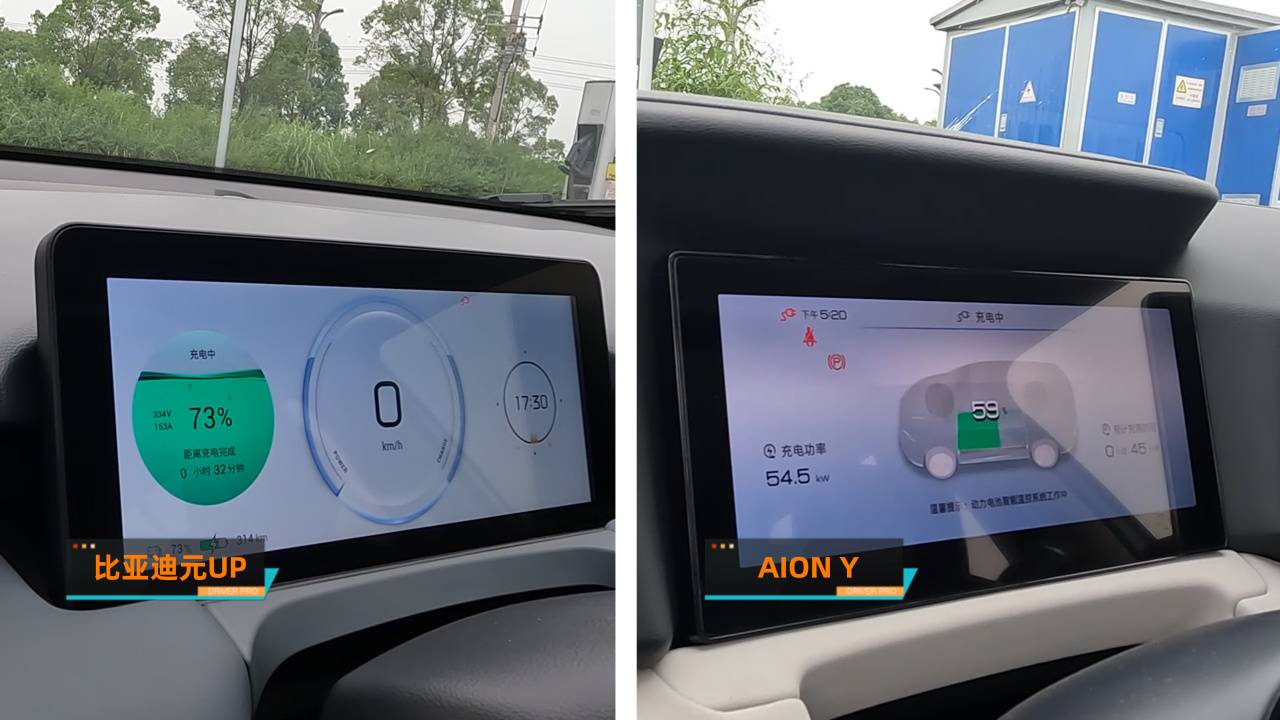 我們也在1000V快充樁上給兩臺車分別進行了充電,比亞迪元UP能長時間穩定在60kW左右的充電功率,而AION Y則在短暫峰值后,大多以50kW的功率補能,所以從效率上看,元UP會略微占優。