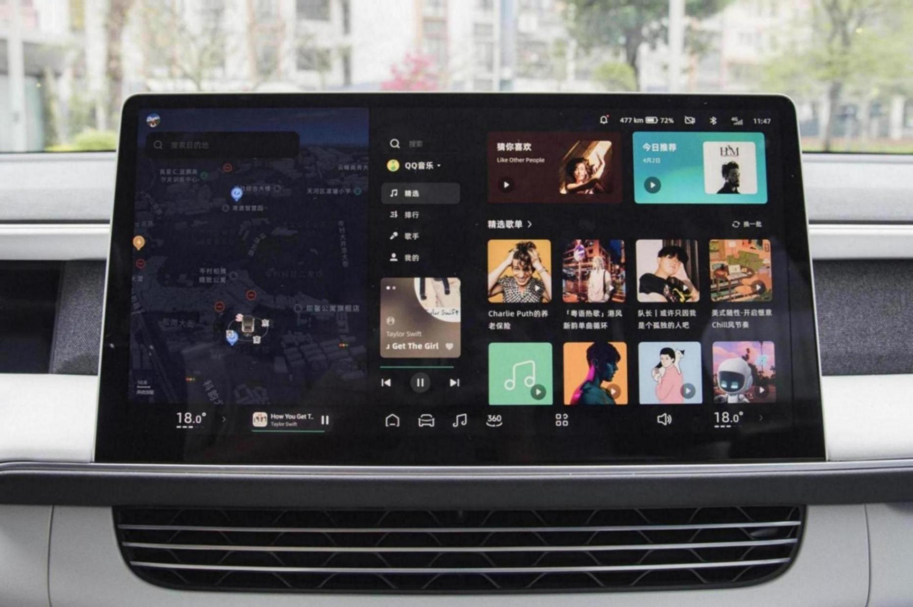 中控屏的尺寸為14.96英寸,下方設計了同等長度的空調出風口,看起來非常協調、舒適。再往下的操控臺位置,取消了檔把和其他結構,保留了兩個手機面板和兩個杯架,符合整體的簡約風格。在功能方面,車輛搭載了導航系統、360°全景影像、車聯網、面部識別、語音識別控制系統和OTA升級等功能,在試駕過程中,其語音助手表現得比較出色,可實現三區喚醒識別、免喚醒、可見即可說等功能,對話延遲低,反應快。