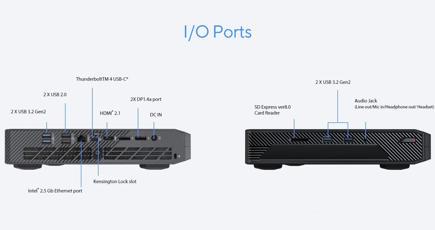 NUC 14 Performance配備兩個 DDR5 SO-DIMM 插槽,支持最多 64 GB 的 DDR5 內(nèi)存;一個 M.2-2280 插槽,支持PCIe Gen 4 x4規(guī)范。網(wǎng)絡(luò)連接包括 Wi-Fi 6E + 藍牙 5.3;2.5 GbE 有線局域網(wǎng)。高帶寬 I/O 連接是 Thunderbolt 4 (40Gbps),同時兼容USB4 40 Gbps,提供一個 USB-C 端口,也支持來自獨立 GPU 的 DisplayPort 1.4 直通;4個 10 Gbps USB 3.2 Gen 2 端口以及2個用于輸入設(shè)備的 USB 2.0 端口、來自 GPU 的額外 DP 1.4 端口和一個 HDMI 2.1。NUC 14 Performance 配備了 330 瓦的電源適配器。