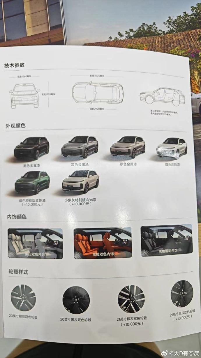 產品頁顯示,理想 L6 的長寬高分別為 4925mm、1960mm 和 1735mm,軸距為 2920mm。新車提供黑色金屬漆、灰色金屬漆、銀色金屬漆、白色珍珠漆四款免費車漆,10000 元可選裝綠色特別版珍珠漆和小象灰特別版冷光漆。此外,新車提供黑白雙色內飾、黑橙雙色內飾、黑色運動內飾。