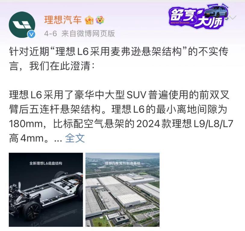 理想如此著急的原因,有業內人士分析,首先是因為理想MEGA未達預期。承認理想MEGA失敗之后,理想L6已成為理想汽車在整個2024年,最不容有失的一款重磅車型。最近,剛有消息傳出,理想L6用的是麥弗遜懸架,理想官方就緊急辟謠,強調理想L6用的是前雙叉臂后多連桿的豪車同款懸架。值得注意的是,理想官方辟謠的時間是4月6日,這時處于清明小長假期期間,所以從這種及時且高強度的公關動作,足以看出理想L6這款車的重要程度。