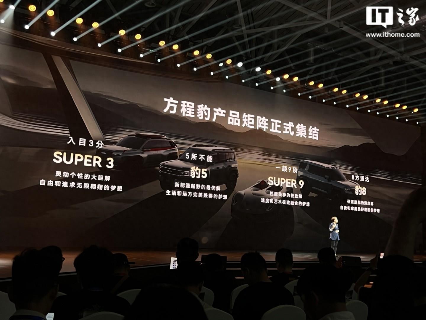 4 月 16 日消息,今晚方程豹汽車春季發布會期間,方程豹旗下豹 8、SUPER 3 和 SUPER 9 正式發布,官方宣布方程豹產品矩陣正式集結,并用諧音梗的形式給出了各大車型的定義。據稱,四款車型都將充分滿足用戶個性化需求。