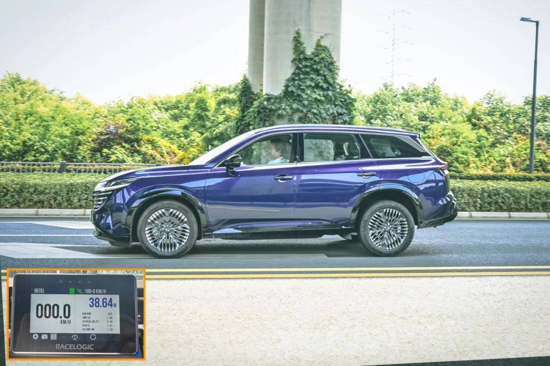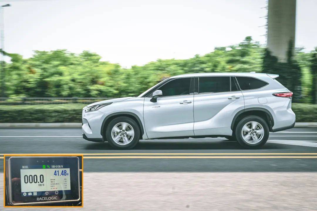 而且在制動方面,日產探陸在體格更大、重量更高的情況下,100-0km/h的剎車距離控制在38.64米,同樣場景下豐田漢蘭達需要41.48米,剎停用時長了0.1秒、瞬間G值也低0.05G,主觀上我的感受是探陸的制動力持續更穩定,制動末端的拉扯感更小,電子輔助介入對踏板的干擾也更輕微,對于緊急情況下的制動操作來說,探陸會友好一些。