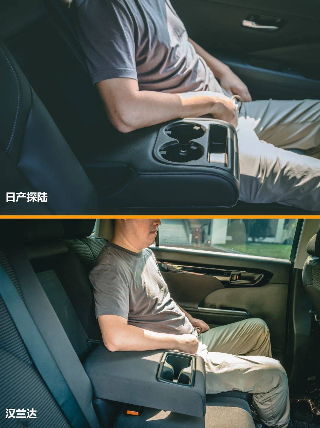 兩款車的二排座椅都提供有可支撐手肘和儲物的中央扶手,探陸相比而言多了一個手機儲物槽,同時也配備了收放的拉帶,漢蘭達在這個細節上顯得不如日產設計用心。
