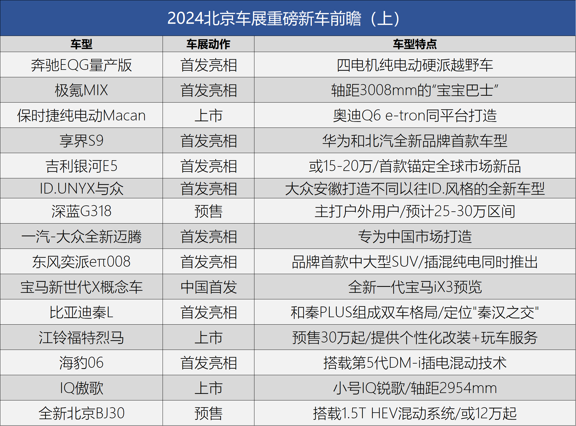 作為2024年最為重磅的車展之一,將于4月25日-5月4日舉辦的北京車展無疑是又將是近年國內規模最大,新車最多的車展,而本期我們就帶您提前了解一下將在本屆車展首發/上市/預售的重磅新車,這其中既有諸如奔馳EQG、全新邁騰、ID.UNYX與眾、IQ傲歌等合資品牌轉型換代之作,也有極氪MIX、享界S9、銀河E5、深藍G318等中國品牌的新流量擔當。那么,就讓我們來一起看看吧!