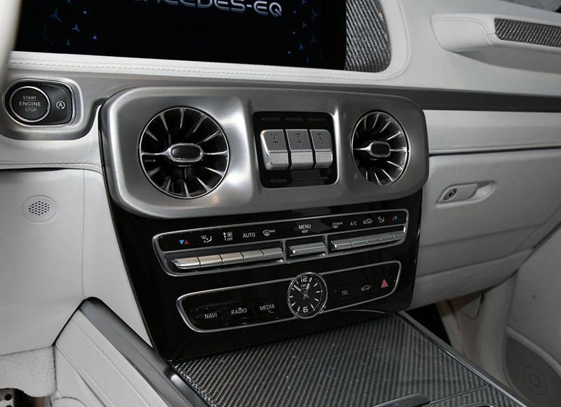 內飾方面,新車與目前現款奔馳G級的設計基本相同,采用了全液晶儀表盤與中控多媒體顯示屏相連接的雙聯屏設計,并搭配了最新的雙三輻式平底運動方向盤,中控臺的設計依舊“G味”十足,中央通道區域則搭配了觸控面板以及一些銀色的裝飾板點綴,即便是純電動車也依舊能夠展現出越野+豪華+科技化相融合的質感。