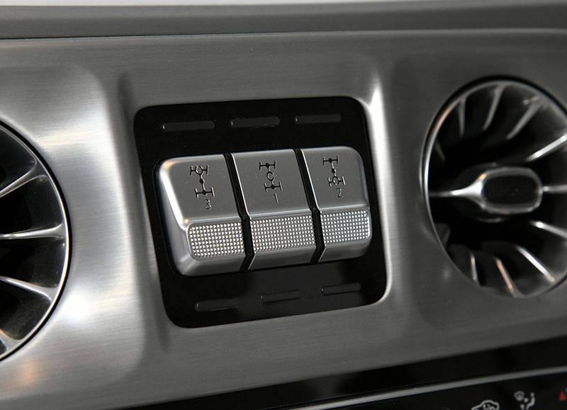 值得一提的是,新車在整個內飾中基本取消了實體按鍵,不過保留了那令人激動的三聯差速鎖按鈕。但是我們觀察到,這三聯按鈕的功能已經有所改變,不再是差速鎖開關,而是EQG Tank Turn“坦克調頭”等功能的開關,該功能可以讓車輛原地360度轉圈。
