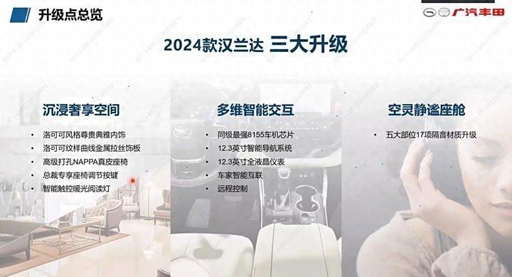 在配置上,新款豐田漢蘭達有三大升級,包括空間、智能化以及座艙表現,新款漢蘭達采用的是金屬拉絲質感的面板,并且采用了打孔NAPPA真皮座椅,還有智能交互的升級,搭載了8155車機芯片,車身17項隔音材料進行了升級。整體來看,新款漢蘭達還是比較值得期待的,雖然整體的質感和同價位的國產車差很多,但是對于一款日系豐田而言算是盡力了。