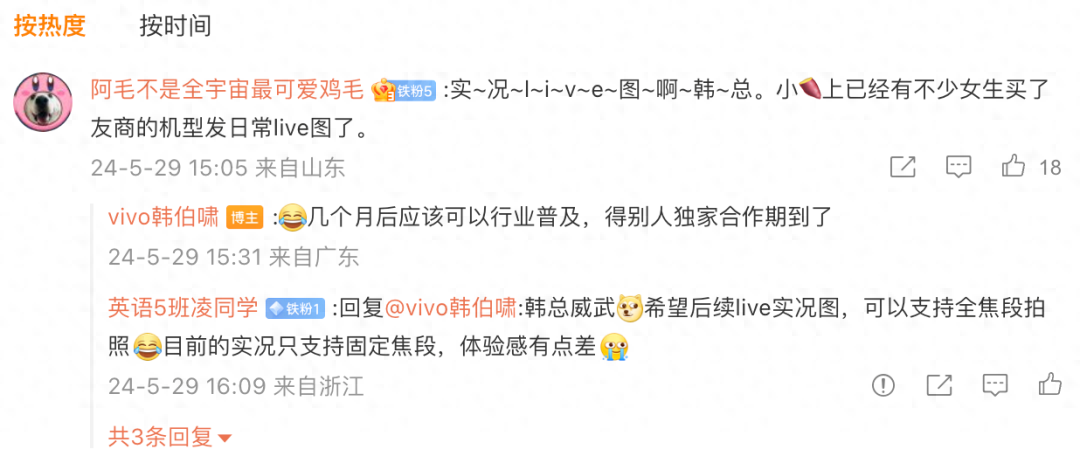 上周OPPO發布了Reno12系列,主打是首個能發布實況照片的安卓機,并支持在小紅書平臺發布和顯示。消息一出也讓不少其它品牌的安卓用戶艷羨。近日有網友在vivo產品經理微博下詢問,vivo什么時候上實況,沒想到答案意外。