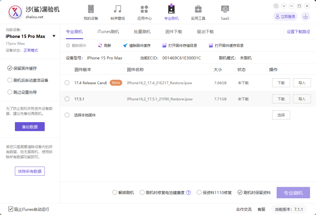 刷機步驟:首先下載安裝平常使用的刷機軟件(沙漏也可以),用數據線把移動設備連接到電腦;點擊上方“專業刷機”頁面,可選擇“刷機后自動激活設備”、“跳過設置向導”,之后選擇你所要刷機的版本進行刷機即可;