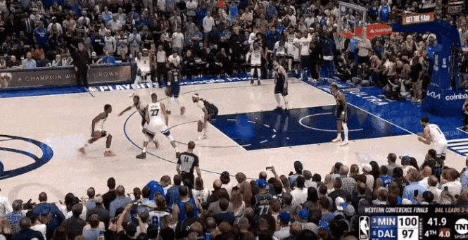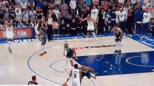 第二場愛德華茲最后連續被夾擊傳球不順,遭了盧卡的絕殺;上一場他找到了心得,多用兩翼跳投,避開達拉斯的中路;今天第四節,分差毫厘之間時,愛德華茲一個韋德式側翼打板中投,然后: