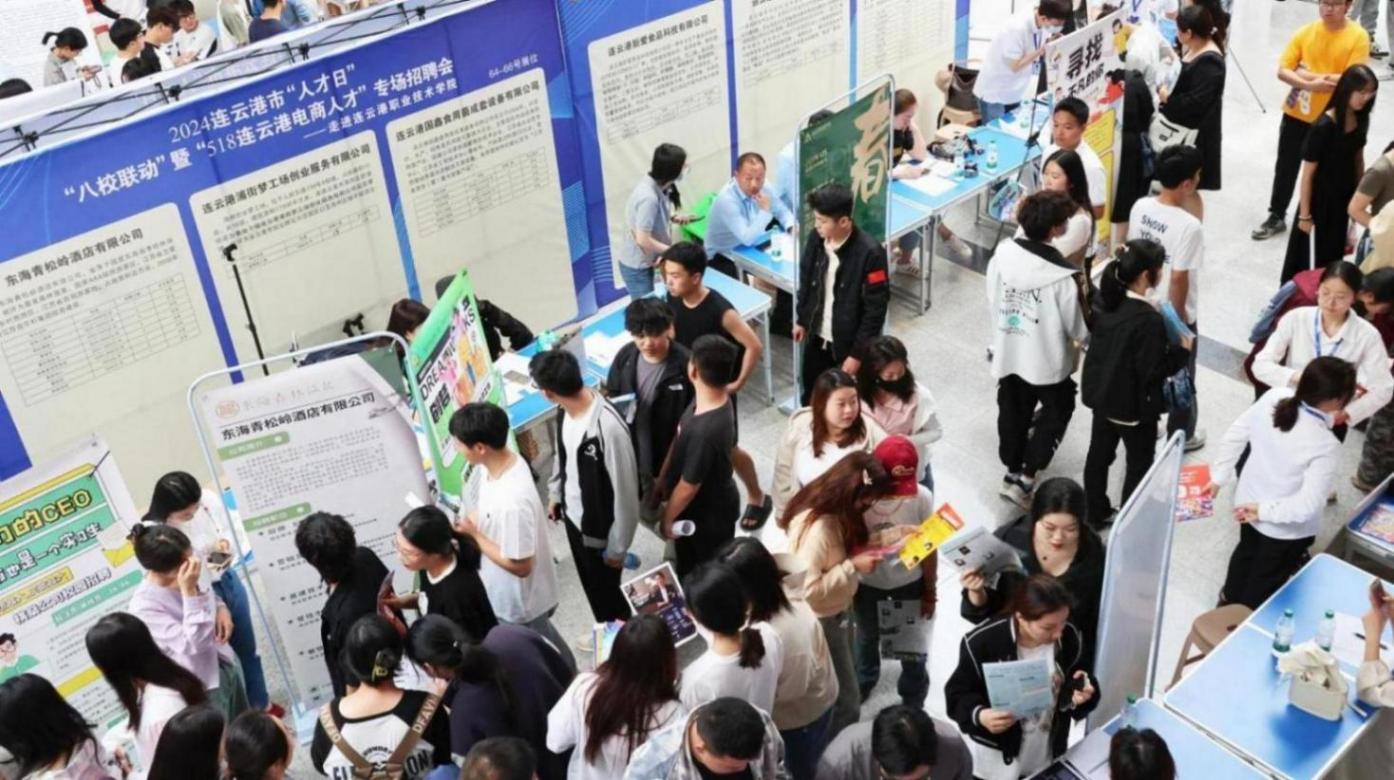 2024年5月16日,江蘇連云港職業技術學院文化藝術中心,眾多應屆畢業生在咨詢了解崗位招聘情況。“八校聯動”暨“518連云港電商人才”專場招聘會舉行,入校招聘企業100余家,涉及電商、石化、新醫藥、新材料、新能源、裝備制造等企業,吸引眾多應屆畢業生到場咨詢應聘。
