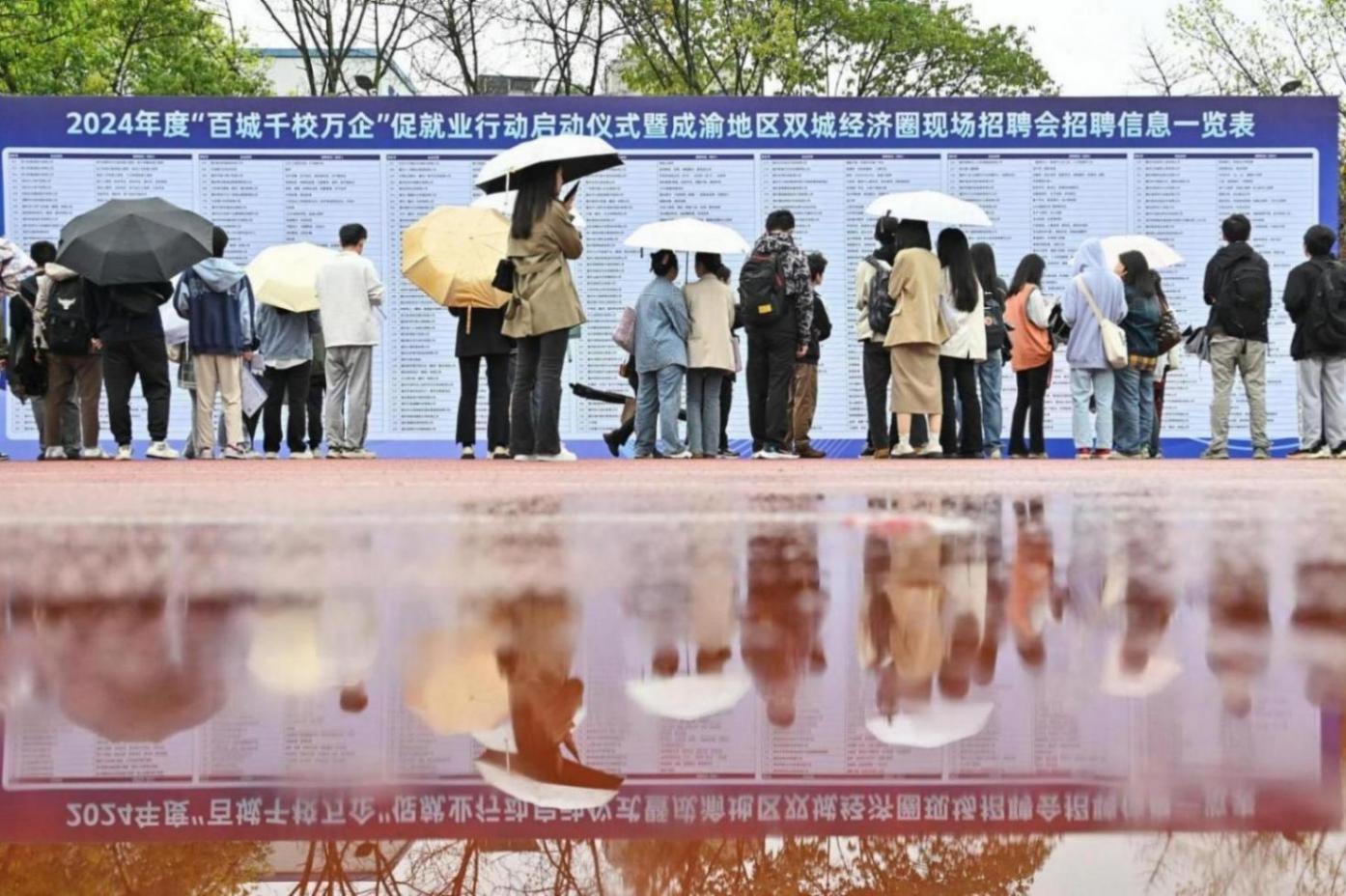 2024年4月9日,重慶,“百城千校萬企”促就業行動啟動儀式暨成渝地區雙城經濟圈現場招聘會在重慶工商大學舉行,748家全國知名民營企業以線上線下方式參與,面向重慶市高校應屆畢業生提供崗位16722個。其中,300家企業在現場擺臺招聘,提供崗位7169個。圖為求職者在招聘會上查看招聘信息。 中新社記者 何蓬磊 攝