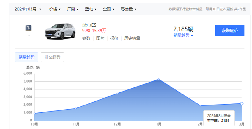 據(jù)統(tǒng)計(jì),藍(lán)電E5在2024年3月零售量?jī)H2185輛,和2月份淡季的1915輛的零售量相比僅有200余輛的攀升,而和1月份的巔峰5289輛相比則仍然呈現(xiàn)下滑態(tài)勢(shì)。事實(shí)上,本以為隨著問(wèn)界M7的火爆,在溢出效應(yīng)的加持下藍(lán)電E5在2024年將有所起色,但從近兩月銷(xiāo)量表現(xiàn)來(lái)看,藍(lán)電E5的表現(xiàn)顯然不夠給力。