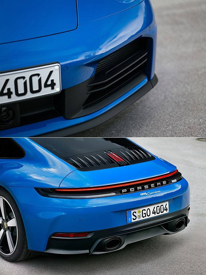 小改款 911 導入新造型設計前后保險杠,并首次將所有照明功能整合至現已成為標準配備的 LED 矩陣式頭燈系統,采用具指標性的四點式設計,省略前行車燈,為車頭更大的冷卻進氣口保留空間。全新設計的車尾進氣隔柵每側有五個散熱鰭片,與后窗連為一體并融入下方的可伸縮擾流尾翼。